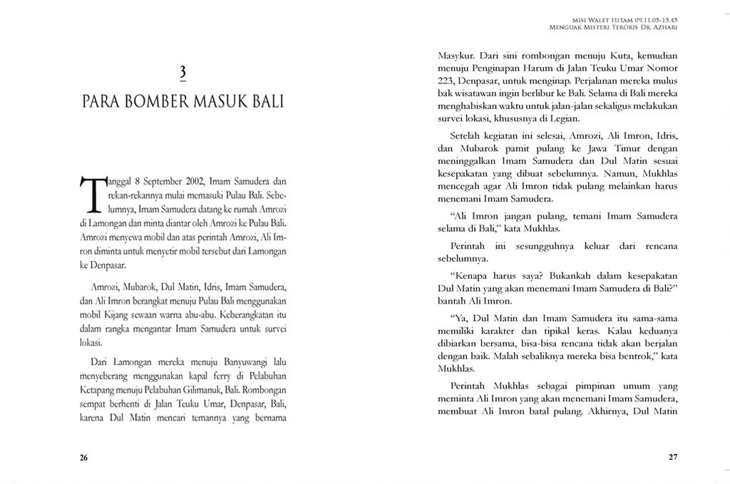 Buku Misi Walet Hitam 09.11.05-15.45 Menguak Misteri Teroris Dr. Azhari, ditulis dari kisah yang disampaikan langsung oleh para saksi hidup, baik para pelaku utama bom-bom yang meledak di Indonesia kurun waktu 2000-2005, khususnya Bom Bali I, juga dari pejabat maupun tim lapangan Polri yang terlibat dalam perburuan para pelaku.
